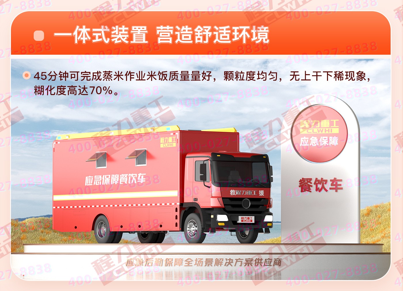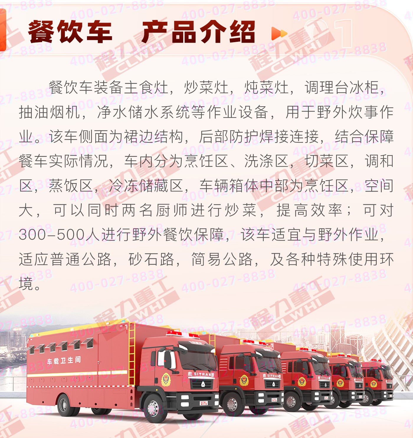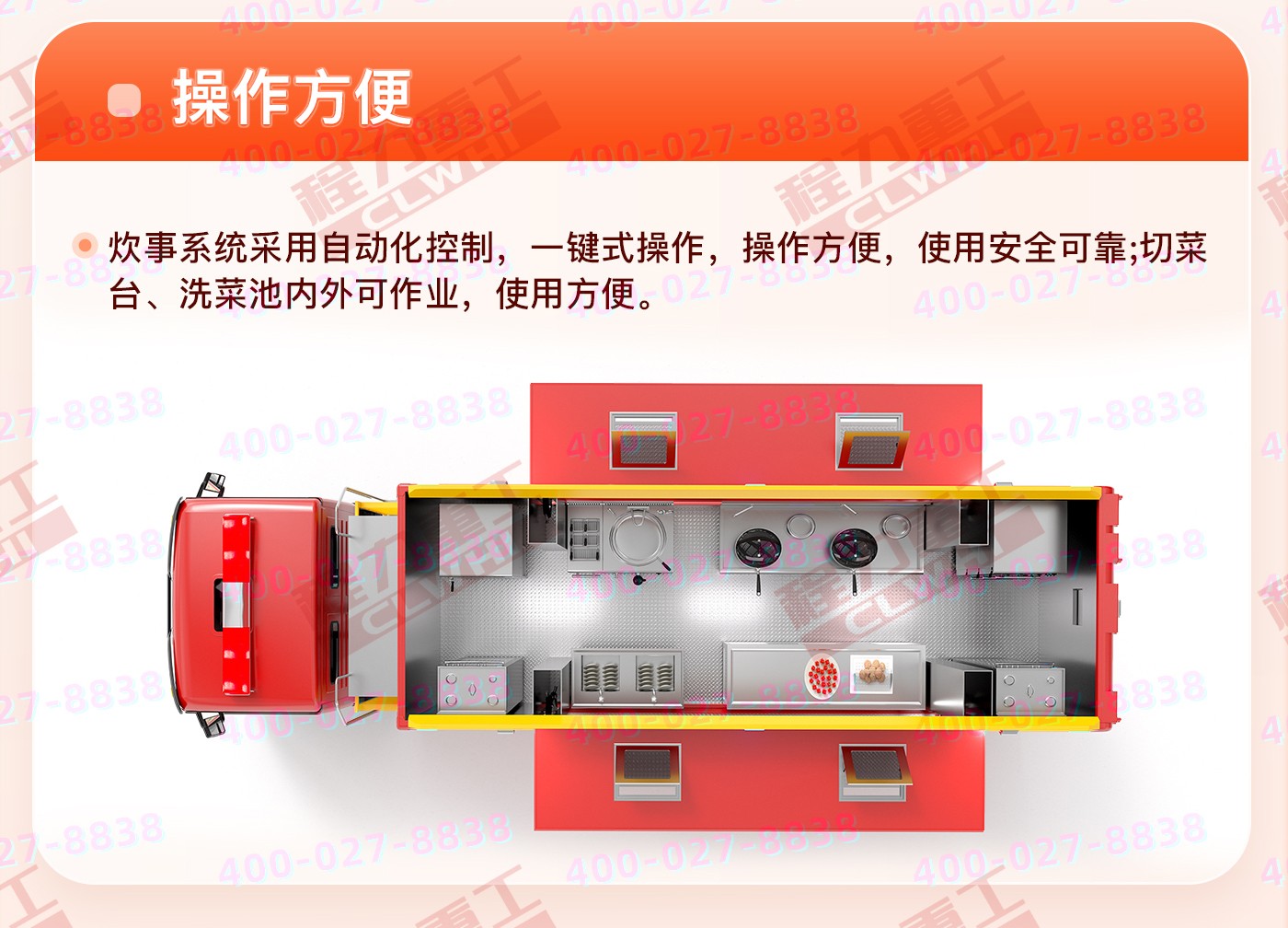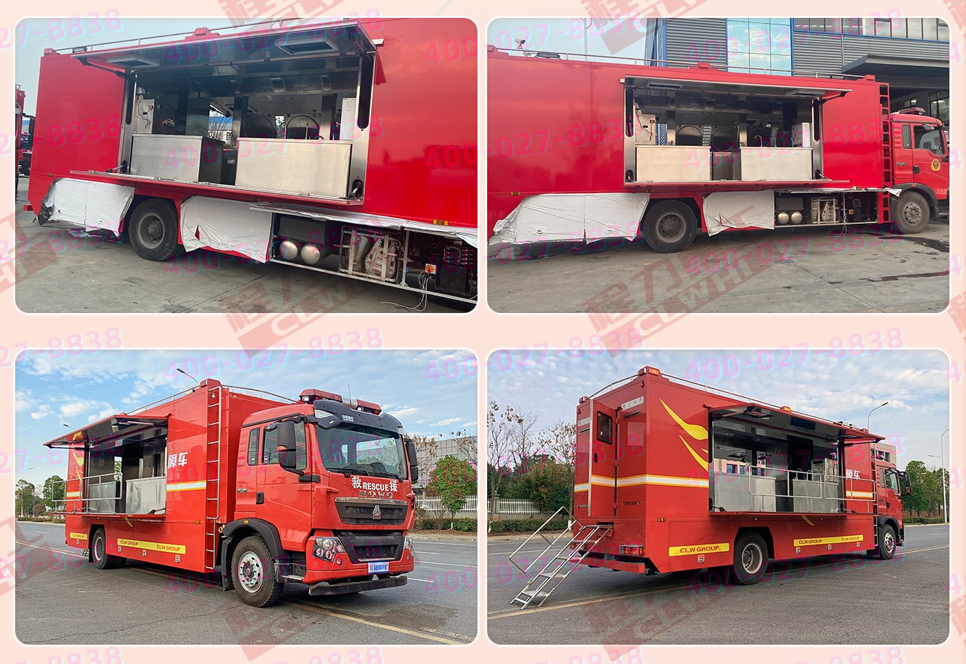 重汽汕德卡飲食保障車集爐、櫥、箱、案與一體,緊湊靈巧;實(shí)現(xiàn)了衛(wèi)生、健康、環(huán)保的要求; 功能性等集合為一體。車廂可兩邊展開作為打餐窗口;車廂內(nèi)飾為不銹鋼,配備不銹鋼爬梯、護(hù)欄、凈水箱,污水箱,雙眼灶,蒸飯車,冰箱等。不銹鋼整體壁柜,工作臺,發(fā)電機(jī),空調(diào)等。該車機(jī)動性能好,專業(yè)性強(qiáng),自動化程度高,自然環(huán)境適應(yīng)性強(qiáng),并能在駐車和行車時進(jìn)行炊事作業(yè),可保障執(zhí)行野外任務(wù)部隊的飲食和飲水供應(yīng)。